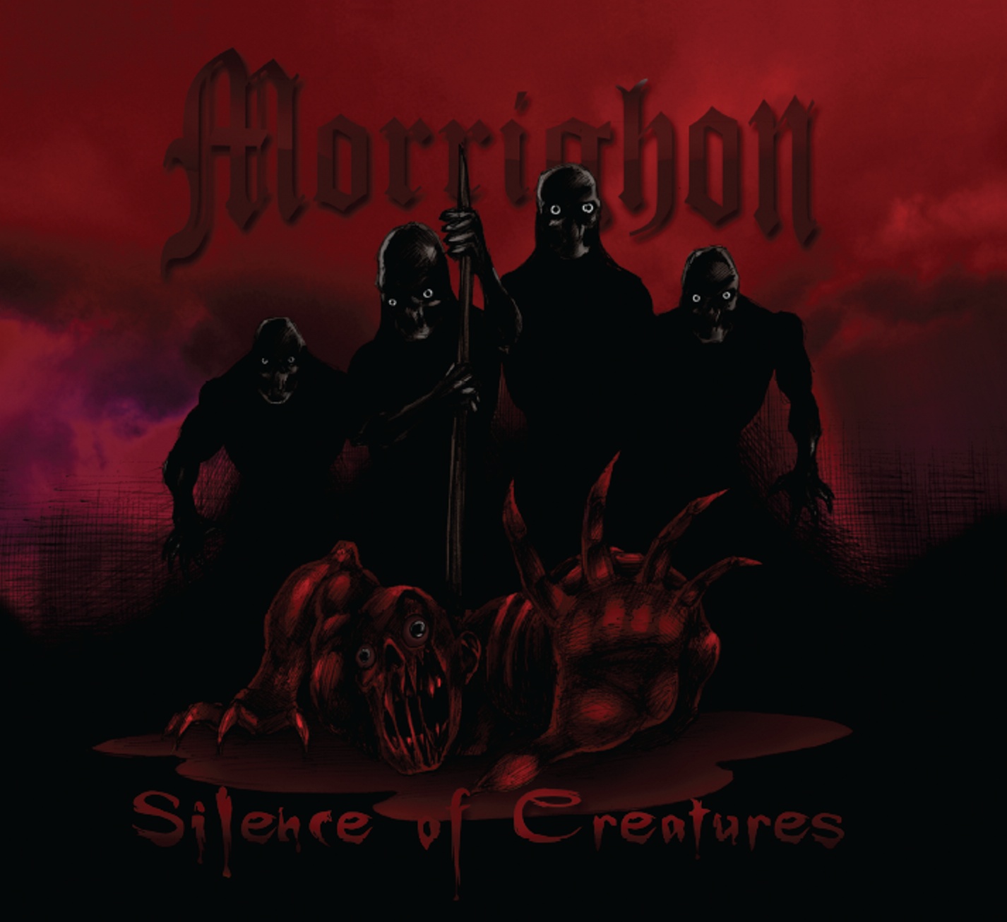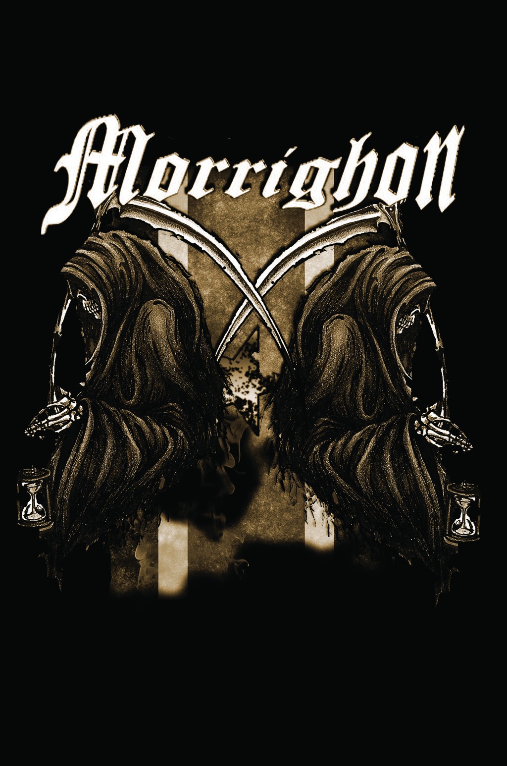 Morrighon is: Hellraiser (rhythm guitar), Kesh (lead guitar), Felix (drums), and Vince (vocals)
